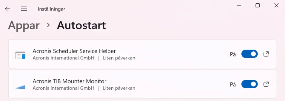 - Gå igenom listan och stäng av reglaget för appar du vet inte behöver köras vid uppstart