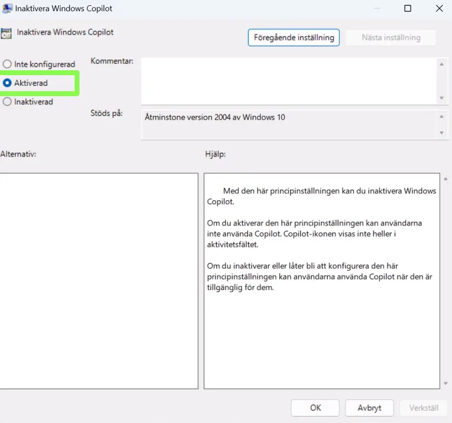 - Välj ”Enabled” (ja, det låter bakvänt, men du aktiverar policyn som stänger av Copilot)