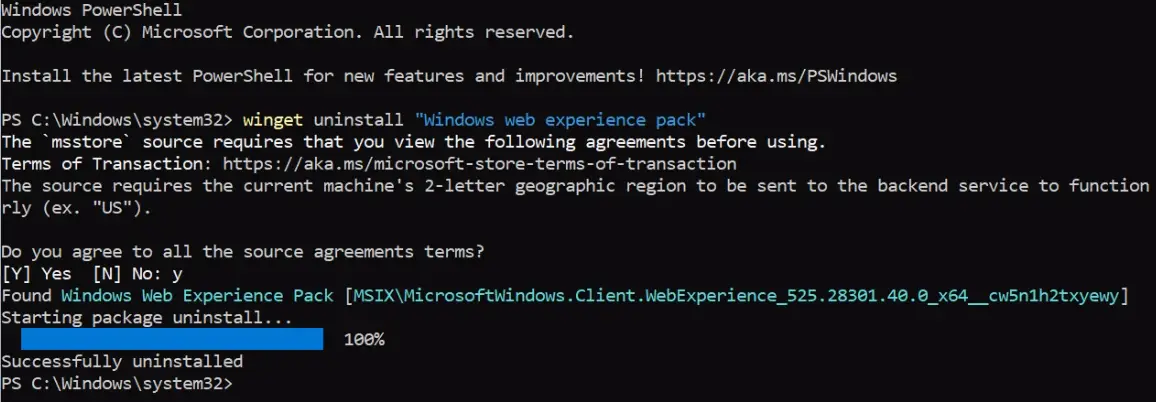 winget uninstall "Windows web experience pack" - Starta om datorn