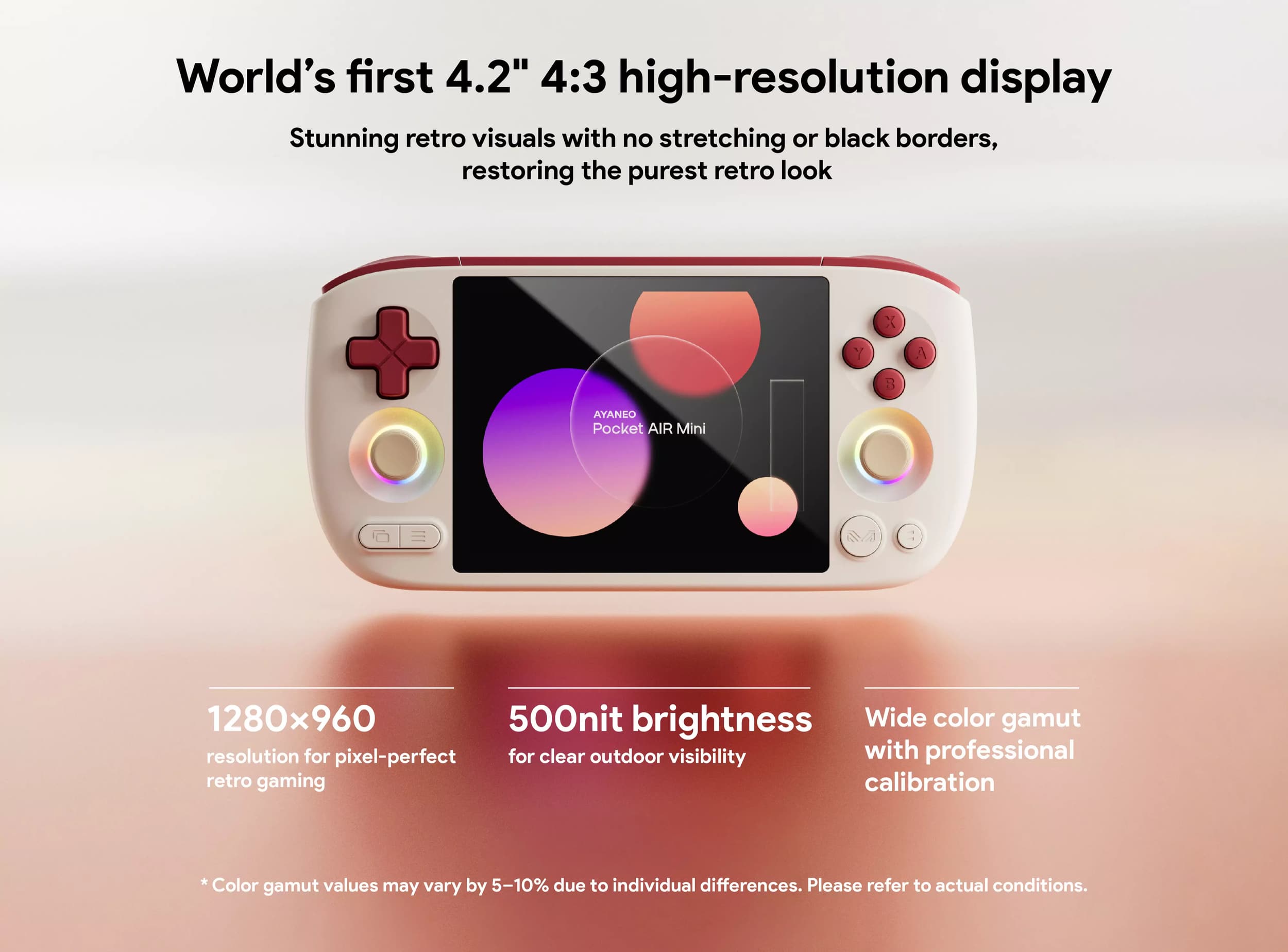 Det första som sticker ut är som sagt den 4,2 tum stora skärmen med upplösningen 1280 x 960 pixlar och bildformatet 4:3. Formatet är avsiktligt valt för att det passar bäst för emulering av klassiska konsolspel från 90-talet – utan de där irriterande svarta balkarna som uppstår när man kör gamla spel på widescreen. Med 500 nits ljusstyrka ska skärmen dessutom fungera bra även utomhus, vilket inte alltid är en självklarhet i budgetsegmentet.