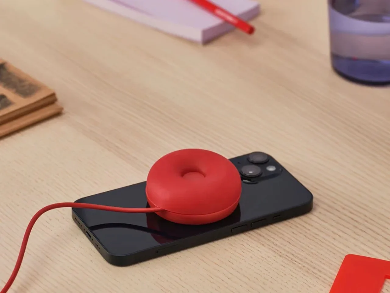 Den billigaste modellen i serien är formad som en röd silikonmunk, men designen tjänar ett praktiskt syfte. Ovansidan innehåller den magnetiska laddplattan medan undersidan kan vikas ut för att fungera som ett telefongrepp.