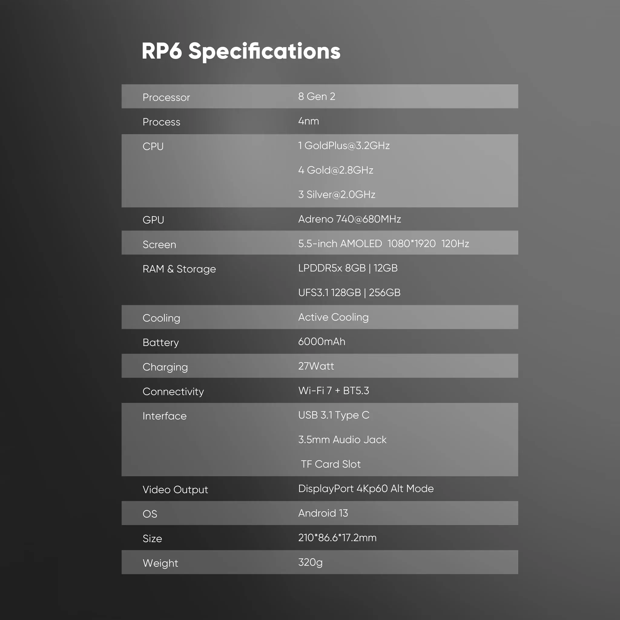Retroid erbjuder Pocket 6 i två konfigurationer. Basmodellen kommer med 8 GB LPDDR5X och 128 GB UFS 3.1-lagring för 209 dollar under förbeställningsperioden (ordinarie pris 229 dollar). Den mer kraftfulla versionen har 12 GB RAM och 256 GB lagring för 259 dollar (ordinarie pris 279 dollar). Båda modellerna stödjer microSD-kort för extra lagring.
