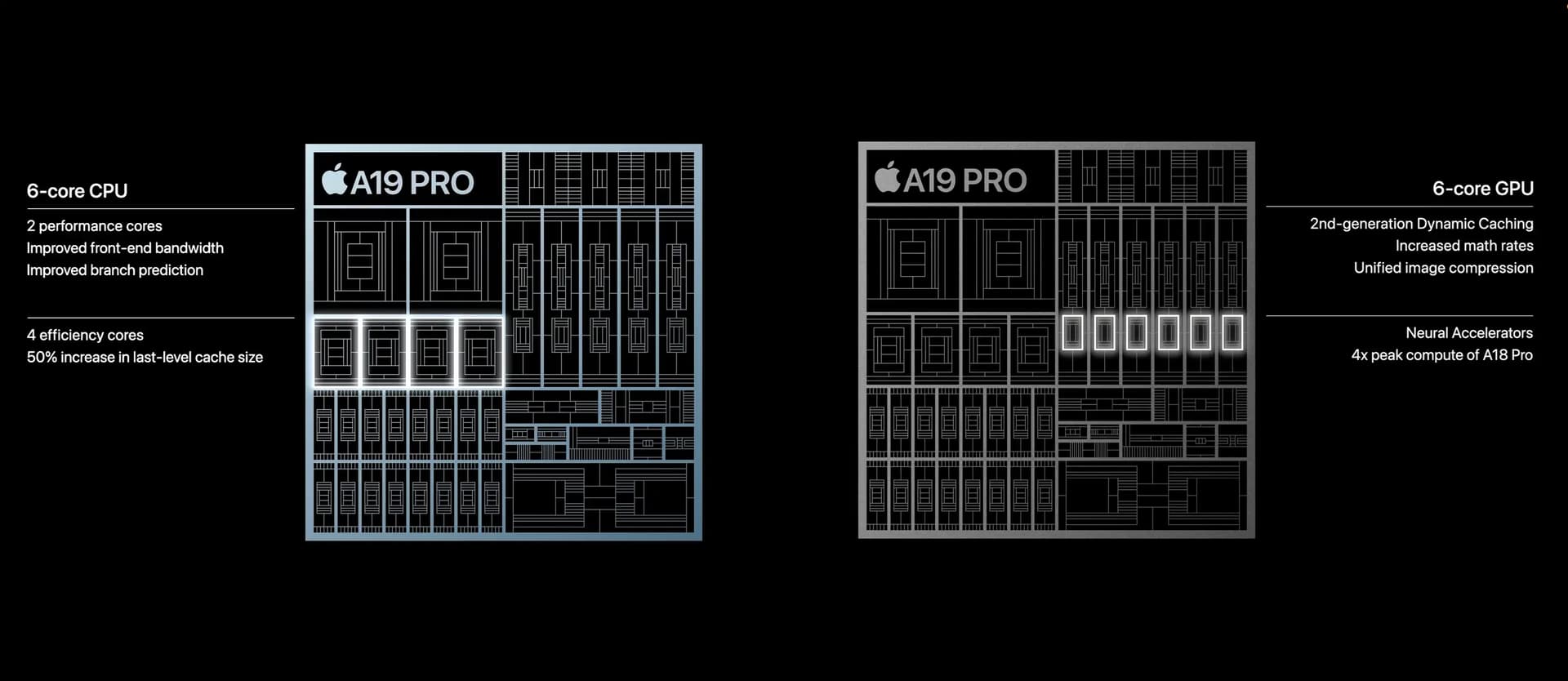 A19 Pro-processorn har två högprestandakärnor som arbetar med upp till 4,26 GHz, vilket är en ökning med 6,5% från föregångaren, samt fyra energieffektiva kärnor. Apple har implementerat flera arkitekturförbättringar, inklusive förbättrad branch prediction och ökad front-end-bandbredd, medan de energieffektiva kärnorna nu har 50% större last-level cache.